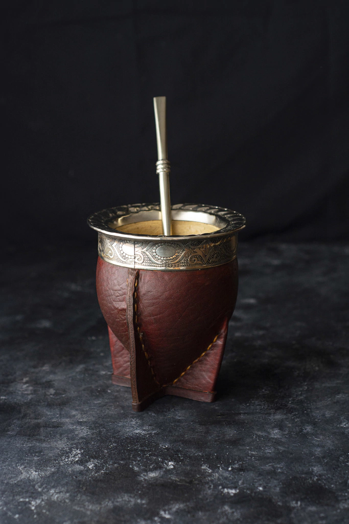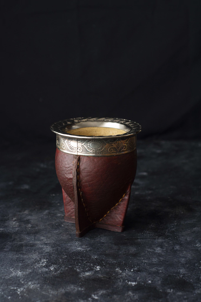 - Mate de calabaza forrado en cuero vaqueta con virola de alpaca.