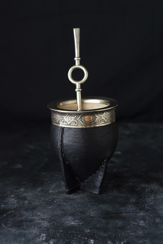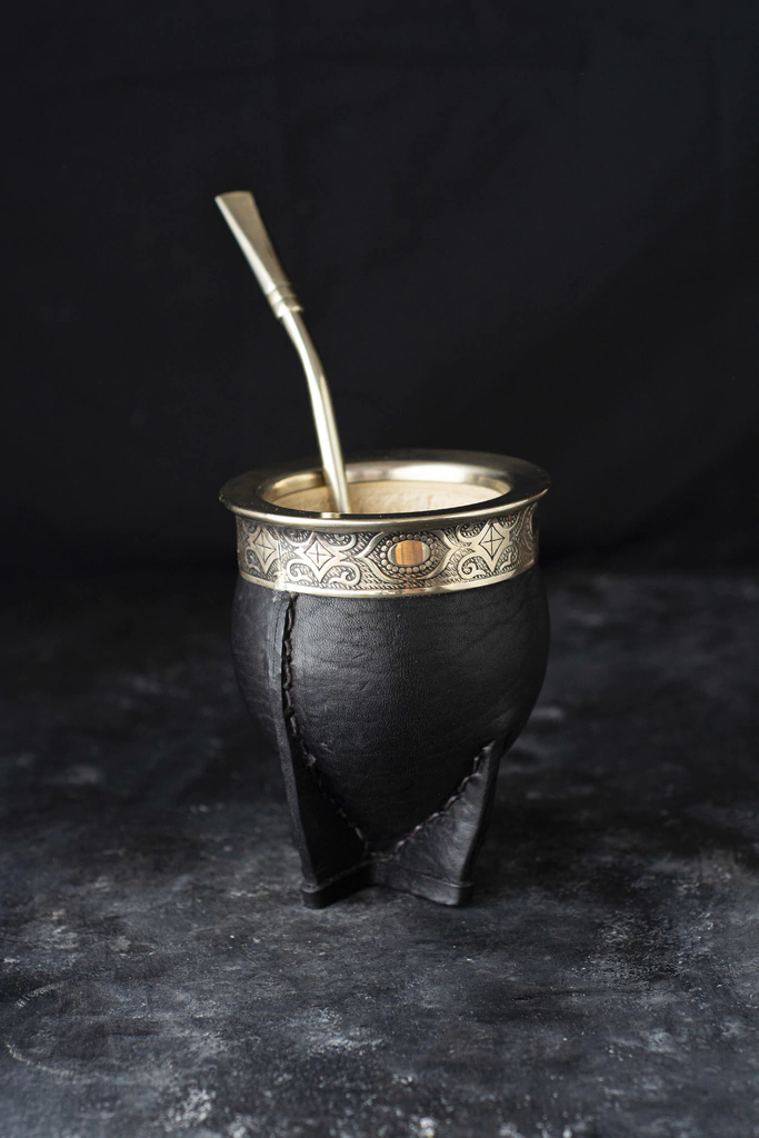 - Mate de calabaza forrado en cuero vaqueta con virola de alpaca.