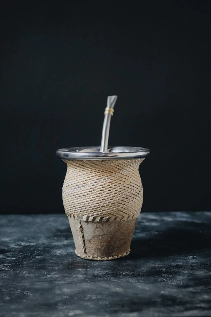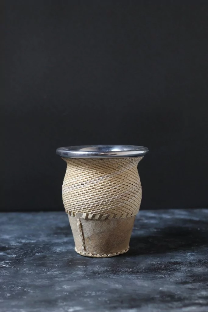 - Mate de calabaza tejido en cuero crudo con virola de aluminio.